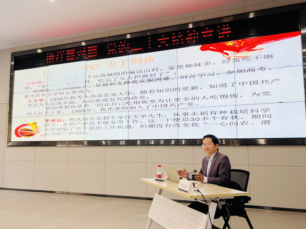 李經(jīng)勇以《深入學(xué)習(xí)貫徹黨的二十大精神 全面推進(jìn)鄉(xiāng)村振興》為題進(jìn)行了宣講。他圍繞黨的二十大精神并結(jié)合自身經(jīng)歷,生動(dòng)地闡述了長(zhǎng)期奮斗在農(nóng)業(yè)科研與生產(chǎn)服務(wù)一線的初心與情懷,他曾帶領(lǐng)渝優(yōu)水稻團(tuán)隊(duì)針對(duì)重慶市種不出優(yōu)質(zhì)水稻的“卡脖子”問(wèn)題開(kāi)展科技攻關(guān),從培育耐高溫伏旱新材料、新品種入手,培育出重慶市首個(gè)國(guó)頒二級(jí)優(yōu)質(zhì)雜交水稻品種“渝香203”,實(shí)現(xiàn)了高溫伏旱區(qū)高品質(zhì)優(yōu)質(zhì)稻品種選育零的突破。他還深入田間地頭、貧困村組和企業(yè)開(kāi)展技術(shù)培訓(xùn),有效加快了新品種、新技術(shù)的推廣步伐,為農(nóng)民增收和脫貧致富提供了支撐。