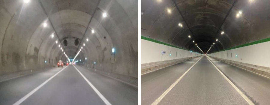 采用新型隧道涂裝材料和工藝,實現(xiàn)隧道整體環(huán)境的亮化,提高隧道線形誘導性、橫通道及緊急停車帶區(qū)域的警示性,提高隧道照明亮度及亮度均勻度,提升照明質量并有效抑制“側墻效應”,提高隧道行車安全性和通行能力。經大量工程實踐驗證,與智能照明控制系統(tǒng)結合運用,該項技術可實現(xiàn)照明節(jié)能15%左右,進一步提升隧道照明品質,增強公眾出行的安全感、體驗感和滿意度?!爸貞c市滬渝、渝黔高速公路隧道群智慧化提升項目”榮獲中國公路學會授予的“2023中國高速公路信息化年度杰出工程獎”。