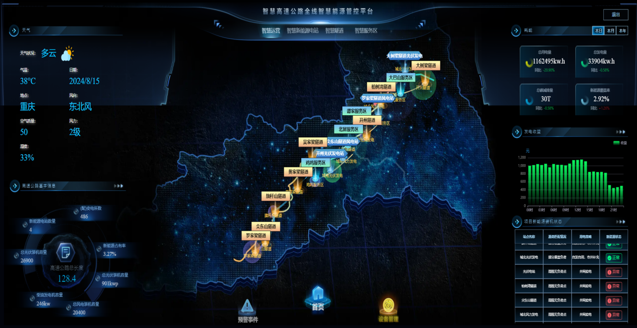 智慧能源管控平臺集高速公路全線供電側與負載側于一體,結合發(fā)電預測、用能預測、可靠性冗余、用能匹配及節(jié)能決策等智能算法,實時分析高速公路沿線綠色能源出力與用能,形成綠色能源不確定性出力與沿線負載動態(tài)用能的匹配決策,實現(xiàn)高速公路全線能源的智能化管理與優(yōu)化目標,助力高速公路全線精準降碳、降本增效。