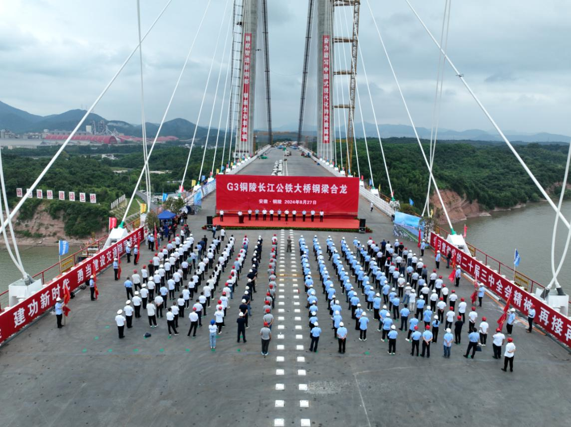 2024年8月27日,隨著大橋兩側(cè)節(jié)段鋼梁準確就位,位于安徽省銅陵市的G3銅陵長江公鐵大橋正式合龍,招商交科下屬萬橋公司董事長、黨委書記李闖受邀參加合龍儀式。