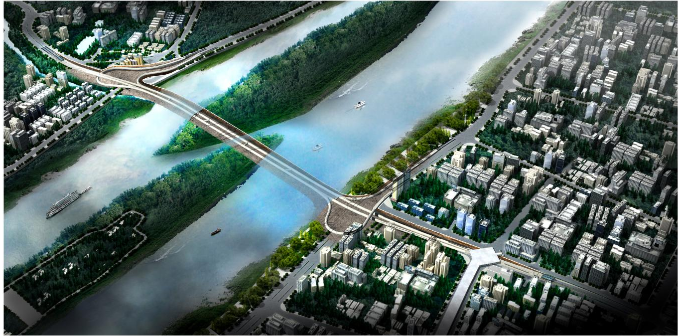 項目位于長沙市市區(qū)內(nèi),位于橘子洲大橋和銀盆嶺大橋之間,下穿瀟湘大道、傅家洲、橘子洲和湘江大道。項目為雙向四車道隧道,匝道為單向單車道隧道。主線設計車速50km/h,匝道設計車速40km/h,為迄今為止最復雜的水下立交隧道,我公司承擔初步設計。