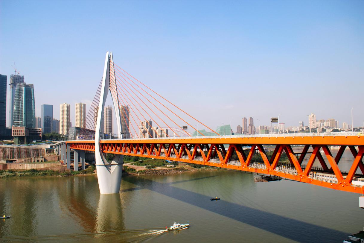 重慶兩江橋包含千廝門嘉陵江大橋、東水門長江大橋兩座大橋。項目位置位于重慶中心,路線穿越了兩江四岸以及CBD渝中半島。東水門長江大橋主橋全長858m,為主跨445m雙塔單索面公軌兩用部分斜拉橋,跨徑布置為222.5m+445m+190.5m;千廝門嘉陵江大橋主橋全長720m,為獨塔單索面公軌兩用部分斜拉橋,跨徑布置為88m+312m+240m+80m。雙層橋面布置,上層為雙向四車道和兩側(cè)人行道,下層為雙線軌道。